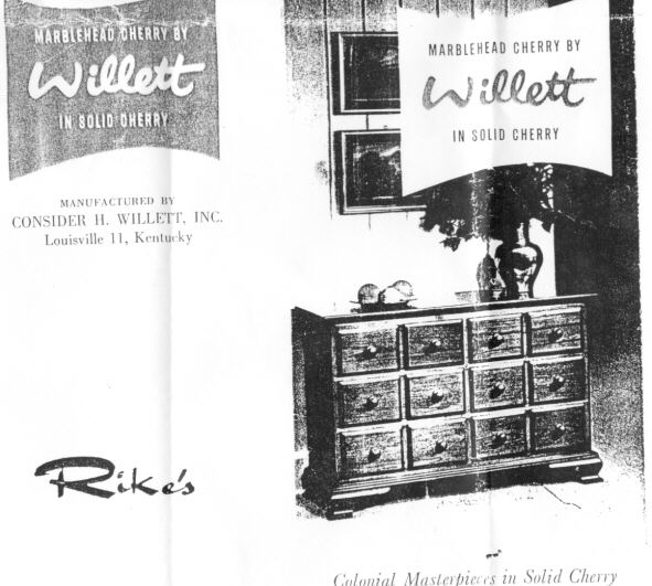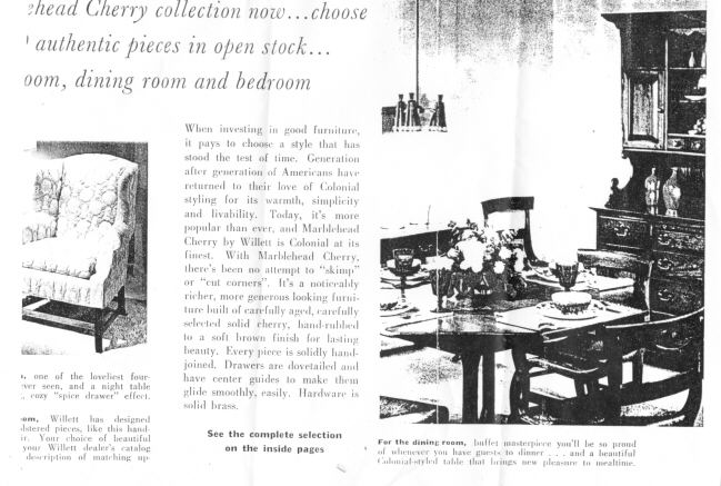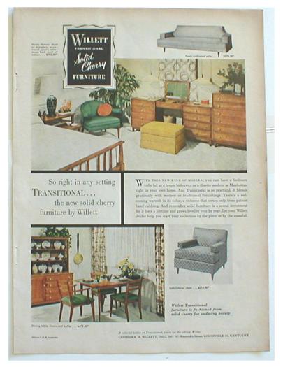 I am indebted to Sue Hayes of Dickson, Tennessee, who happened to have saved the April 1957 Better Homes and Gardens, which contained an ad for Willett furniture. Apparently the ad was introducing a new line or collection, called the "Transitional" line. The ad notes that this new line was more contemporary than the other, previously introduced lines. Remember, 1957 was at the height of the move toward Danish modern and blonde furniture using lighter woods and featuring very spare designs almost free of ornamentation. In looking at this ad, it is clear that Willett was trying to move a bit in this direction while still keeping the furniture somewhat traditional--hence the Transitional name for the collection.