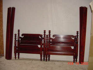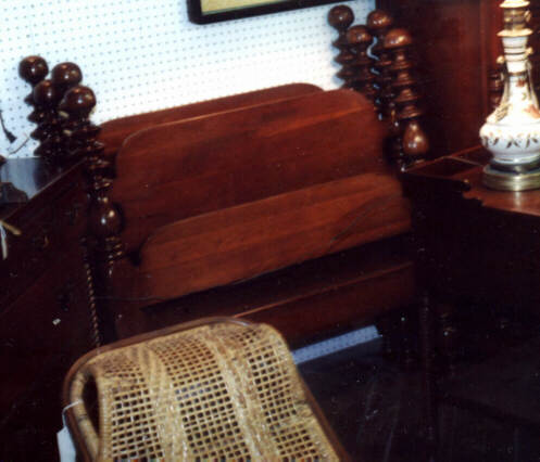 This is a Twin bed Rebecca Beatty spotted at the Louisville Antiques Mall. It has the same unique trim that Sue Hayes' dining furniture had. I am told that this is sometimes called the "button" design as the trim looks like stacked, wooden buttons.
