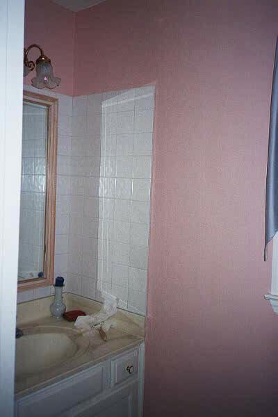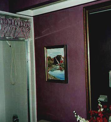 The hall bath was painted a deep mauvy red,BM 1265 and 1266 employing the