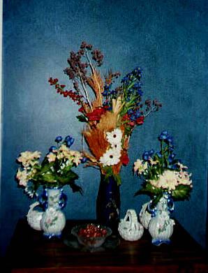 flowers are stenciled with rubber sponges, using lefty over glazes from the den.