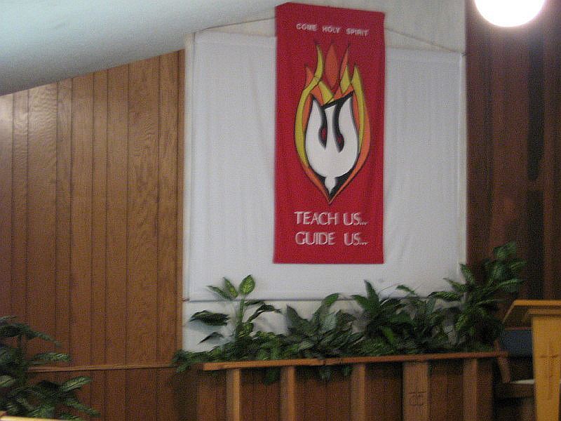 The sanctuary has six stained glass panels at either side that let in considerable light during the day and the fellowship area has three large windows each with twin vertical panes. Some simple means of easily controlling light in both spaces was needed. On measurement we discovered that the sanctuary panels were approximately 60 inches tall and 22 inches wide. Interestingly, each panel of the fellowship area windows was only slightly wider than that but a little shorter. We quickly thought it might be possible to use the same panels to control light in either space. We easily found elegant black cloth 60 inches wide in Wal-Mart’s $1 a yards closeout bin, so six yards of that was in order. Then we needed spring tension rods that could be adjusted between 22 and 24 inches wide so that they could be used in either set of windows. We ended up cutting the 6 panels each to a 30 inch width, making a small hem at the top of each to hold the spring tension rod. That means that each panel has a bit of fullness and drapes well.