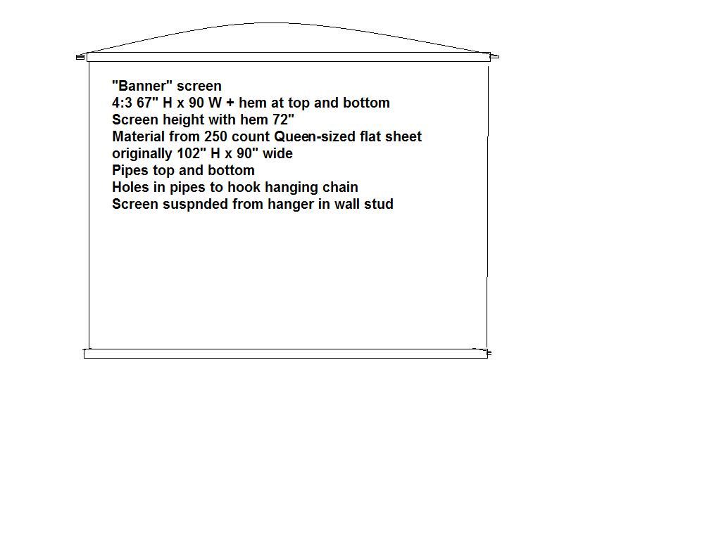 As is apparent from the photo I had to clear a light switch on the right as well as a furnace register in the upper left. But that left me with the exact space I needed for a 48 inch high 16:9 screen and dictated the 85.33 inch width. With only the chain links and hooks holding the screen at the top, the screen wanted to move away from the wall at the lower right corner. But a quick way of resolving that problem was to hot glue a short strip of Velcro to the back side of the screen and to the wall beside the light switch, and the screen now hangs true and tight against the wall, exactly clearing the plate cover for the light switch.
