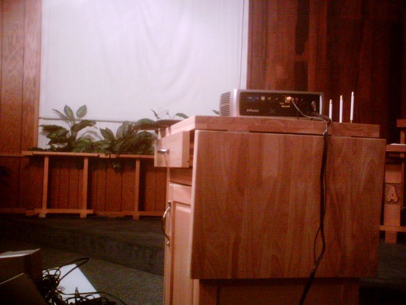 If the past weeks I have had more opportunity to use the equipment, screens and blackout panels to show an actual movie (appropriately, “Luther”. The photo below shows the projector and sanctuary screen with the overlying banner removed. The slight unevenness or sag in the photo is not apparent at all once the movie starts. I continue to be amazed at how well the InFocus IN24 projector works in this situation and that the Insignia 5.1 sound system can play to quite loud volumes as well. In a larger sanctuary space this equipment might need to be upsized a little.