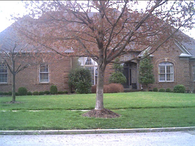 A few lots in Shadeland East remained vacant for a period of time after the subdivision was largely completed, and were finally built on in the mid 1980s. By that time there were substantial changes in home design, reflecting a new traditionalism. These homes characteristically combine hip roofs with gables, and use many different roof pitches in a decorative way. Brick in earth tones is also characteristic of these homes. Fan windows and arches are another feature, with bits or ornamental trim that would never be found on a 70s contemporary design. This house has all these features and announces to the world that it was built over ten years after most of the homes in Shadeland East had been completed.