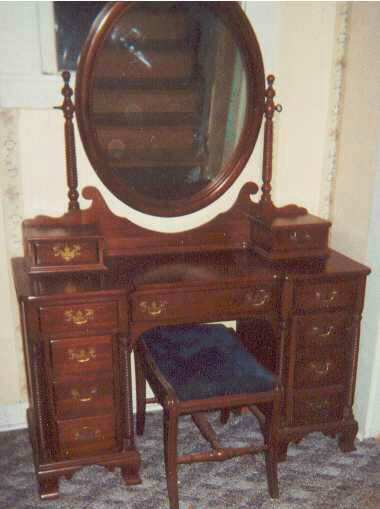 This is a Willett Vanity. I suspect this piece was made somewhat earlier than many of those pictured heres, as this type of furniture was popular before World War II. This may date from the late 30s and early 40s. Note that the rope motif appears in many different places. Along either side of both banks of drawers, on the supports for the oval mirror, and even the long center horizontal brace of the upholstered bench.